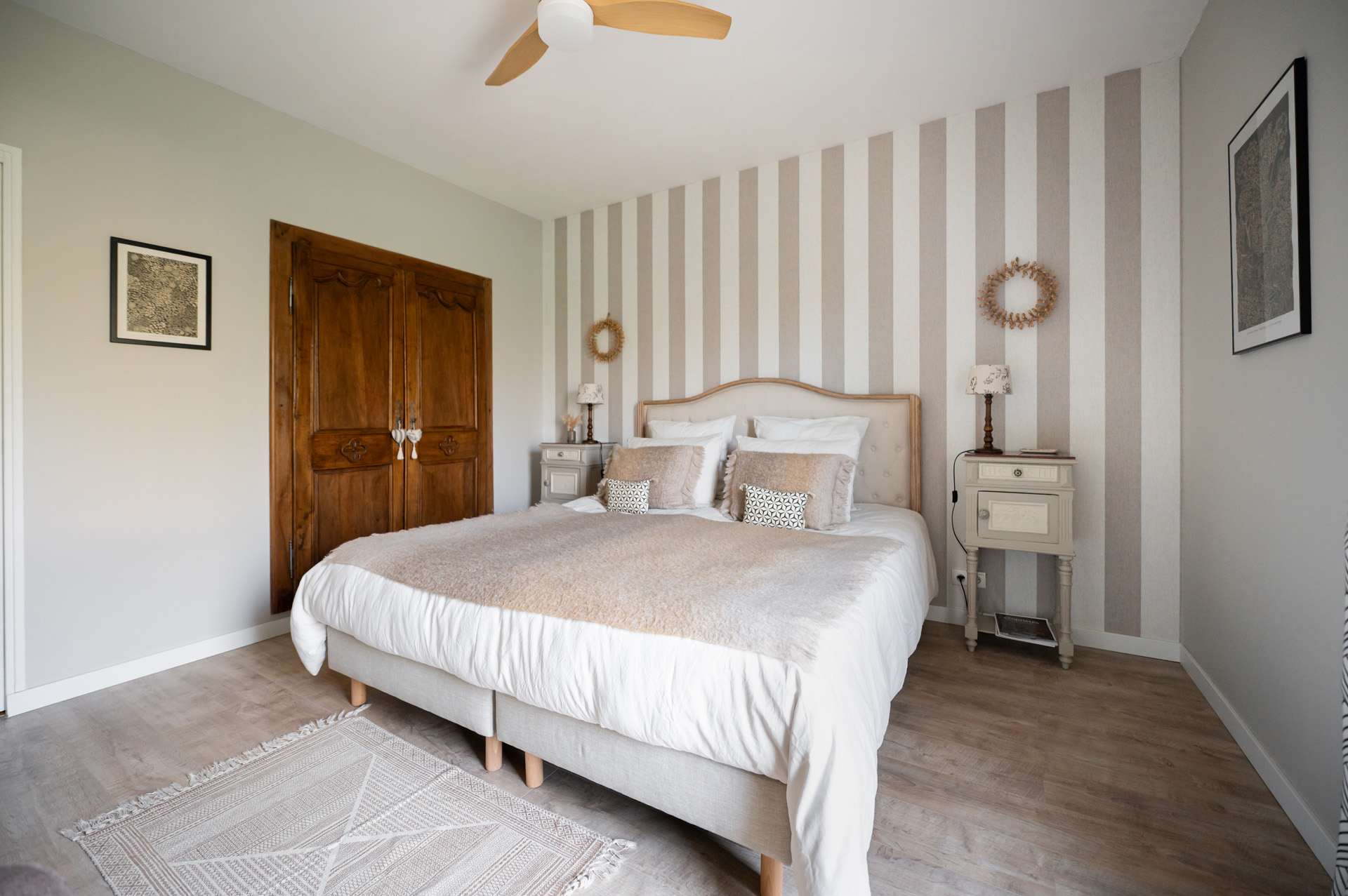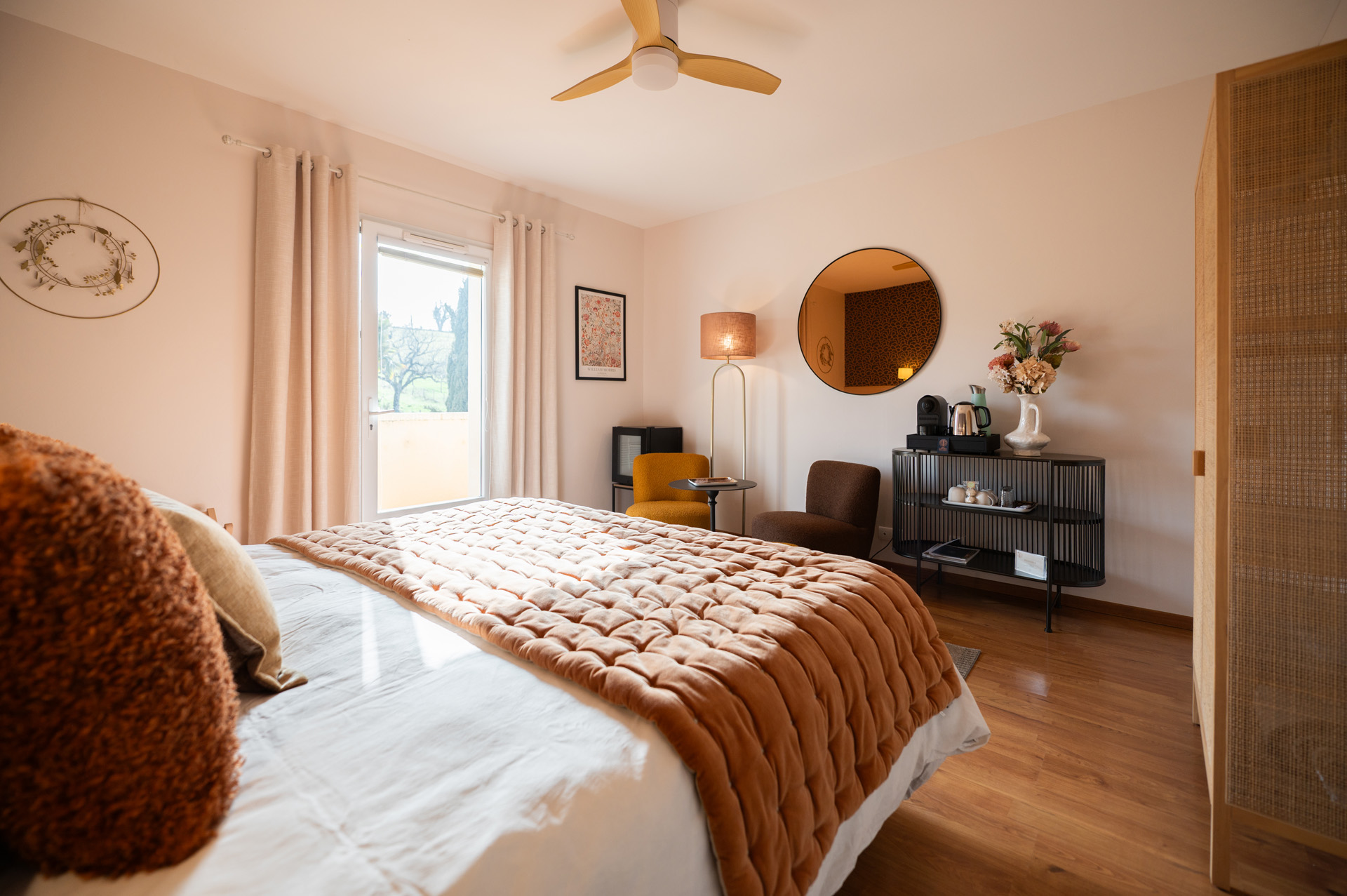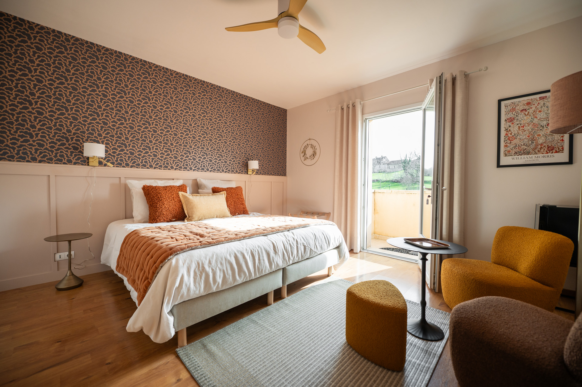 La Beynac vous séduira par son ambiance romantique et cosy. Ses tons fleuris de rose et vert rappellent le jardin bucolique et la piscine sur laquelle donne la chambre. En hauteur puisqu’à l’étage, heureusement moins que son château éponyme dominant la vallée de la Dordogne.