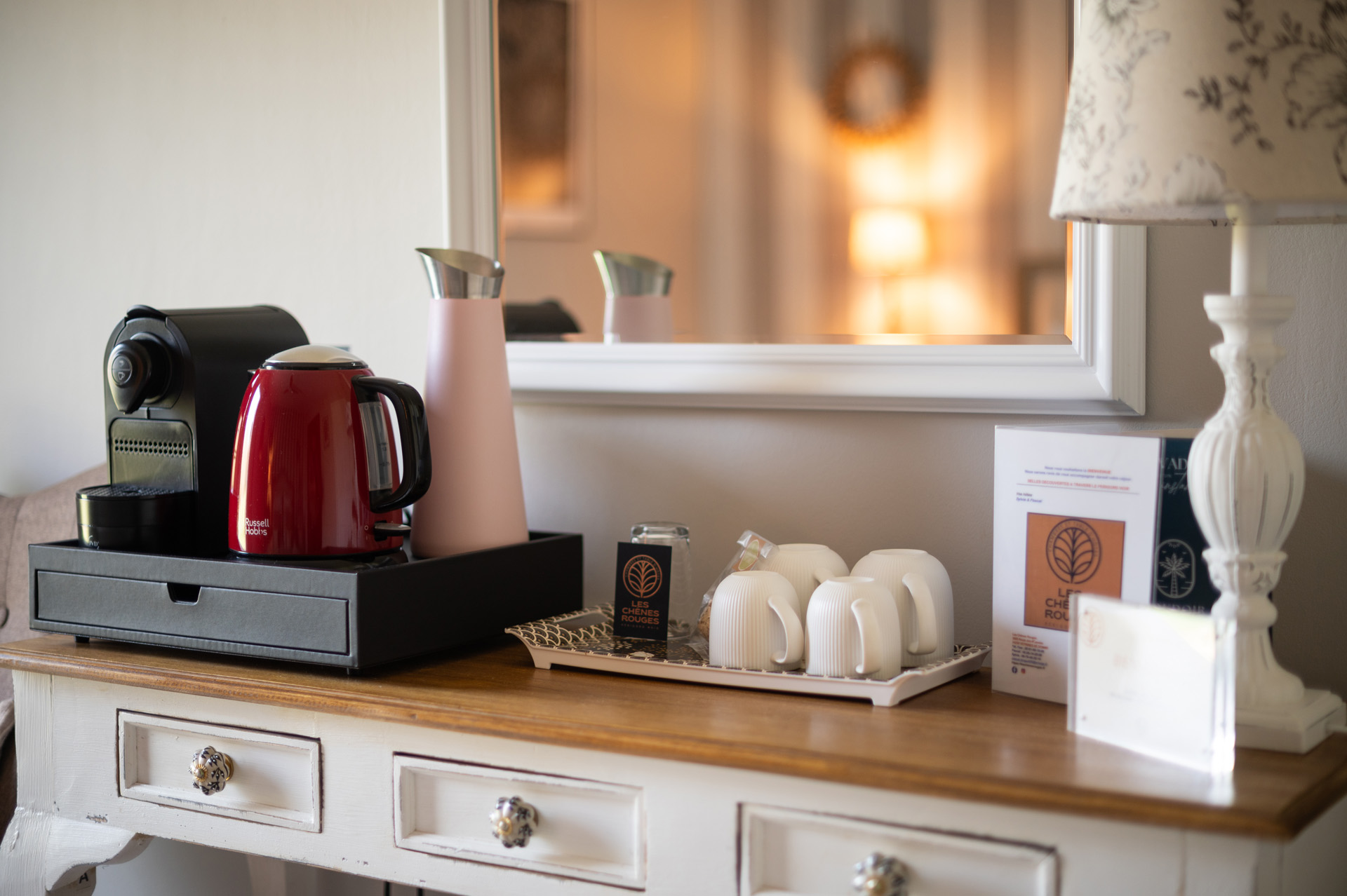 DLes chambres d’hôtes les Chênes Rouges, ce sont 3 Chambres Confort à la décoration soignée et personnalisée ouvertes toute l’année. Chaque chambre dispose d’une entrée indépendante avec salle d’eau et toilettes privées, est équipée d’une très bonne literie. Les petits-déjeuners traditionnels sont servis en terrasse ou dans la salle à manger. Dans ce cadre bucolique, vous serez séduits par la nature environnante propice à une halte relaxante sur la terrasse ou au bord de la piscine. Pour respecter ce cadre et vous inciter à une véritable déconnexion, nous avons pris le parti de ne pas équiper nos chambres de télévision. N’hésitez pas à vous munir de vos smartphones, tablettes et livres.