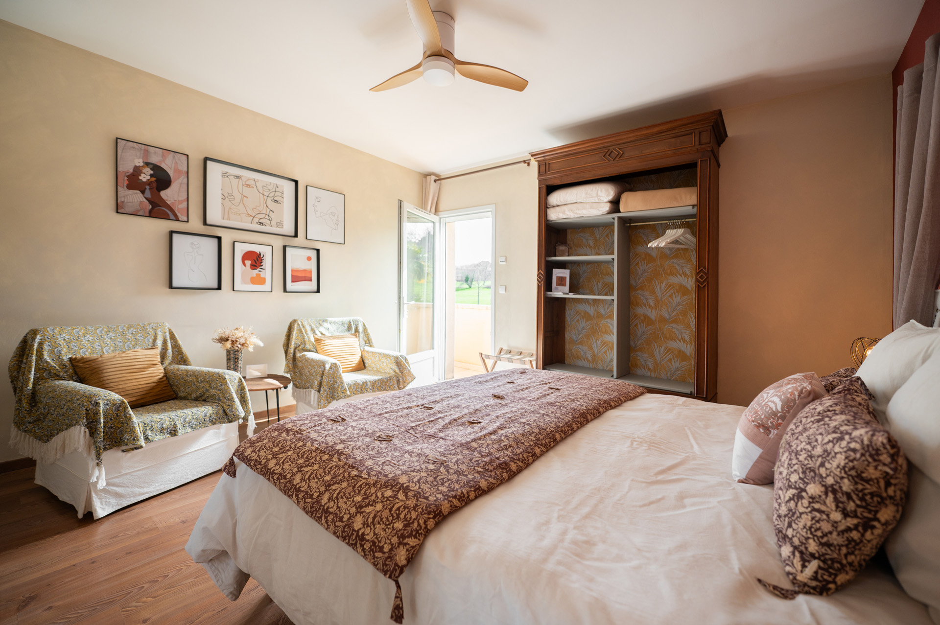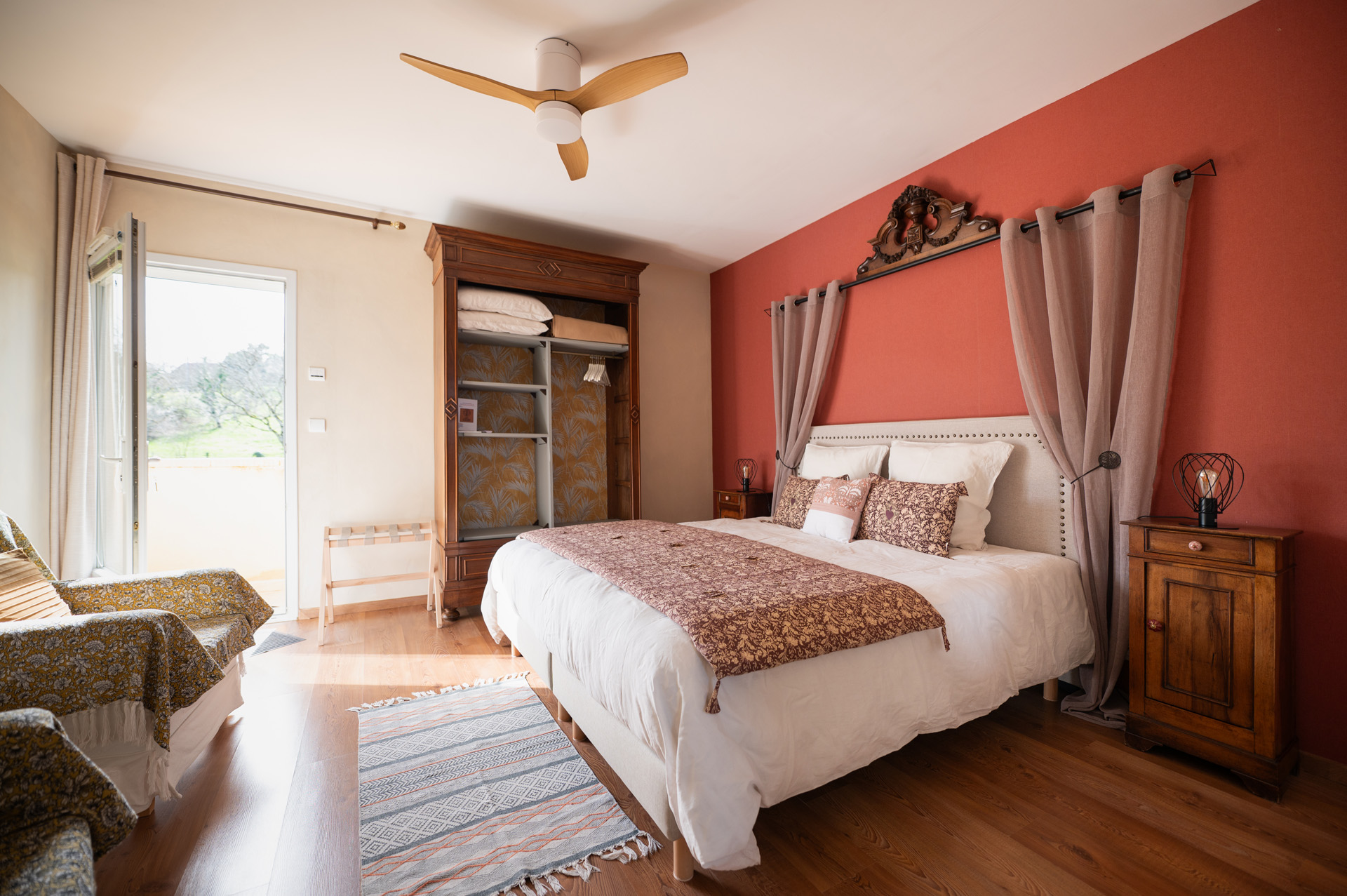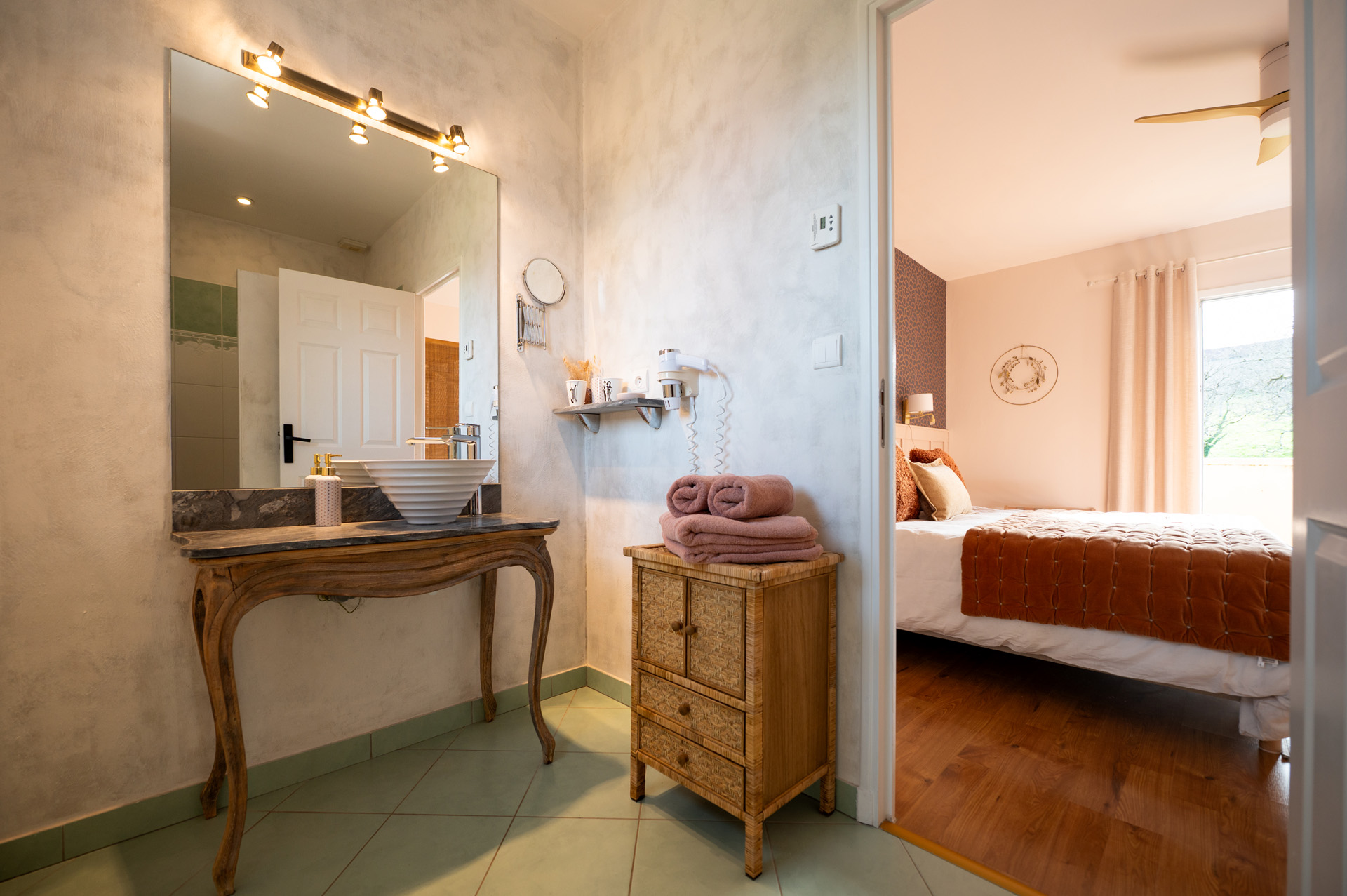 Une atmosphère de château mêlée à une touche contemporaine, la Castelnaud est en lien avec le château éponyme et plus généralement avec le Périgord Noir, Pays des 1001 châteaux. Meubles anciens, couleur terracotta et lin, vue sur le Jardin.